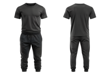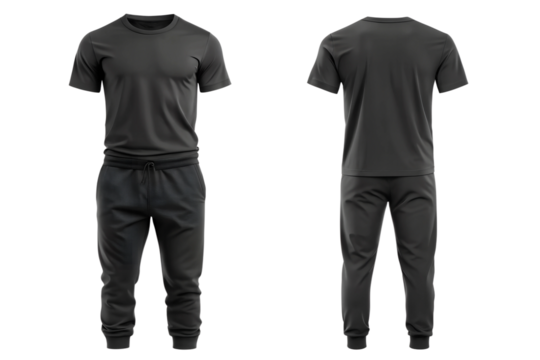 Men's sportswear grey suit tshirt mockup and trousers isolated front and back view on transparent background. Man grey tracksuit cloth mock up template for design. PNG