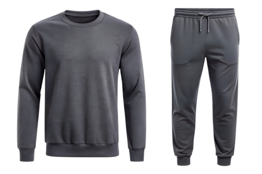 Men's sportswear grey suit sweatshirt mockup and trousers isolated on transparent background. Man grey tracksuit cloth mock up template for design. PNG