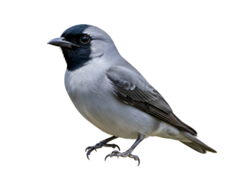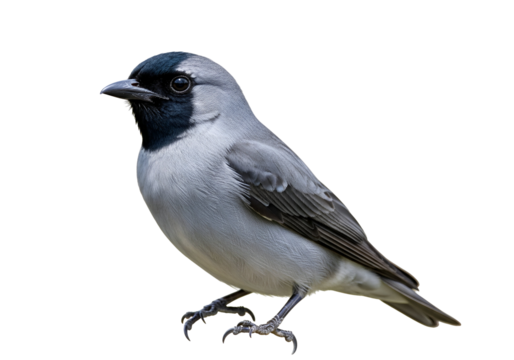Detailed close-up portrait of a small grayish bird with striking black accents, set against a pure black background.