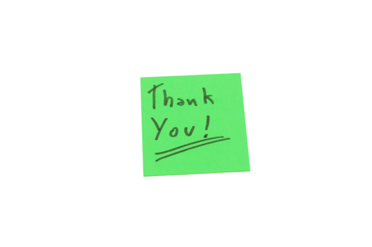 messaggio "thank you" su un biglietto in carta verde quadrato isolato su sfondo bianco o trasparente
