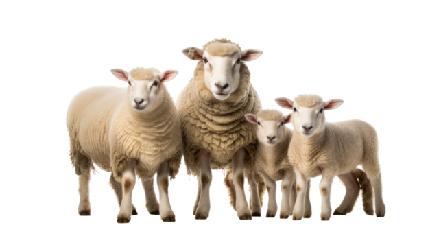 Five sheep standing looking forward on a transparent background, PNG image, PNG file