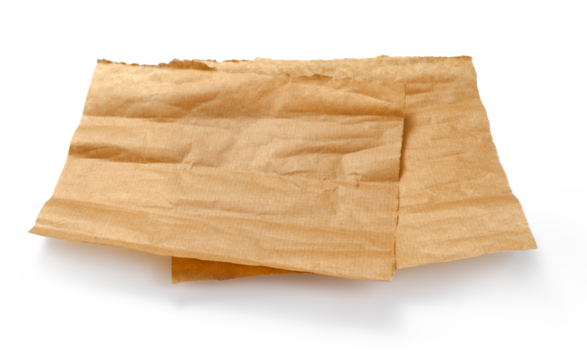 Baking paper isolated. Crumpled pieces of brown parchment or baking paper on white background. Design element.