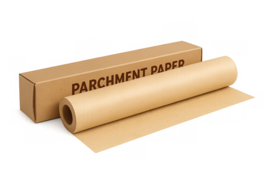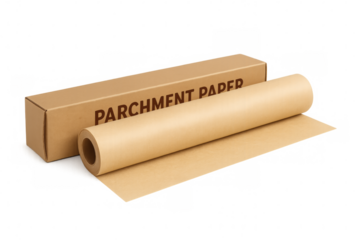 Roll of parchment paper unrolling from cardboard box on transparent background
