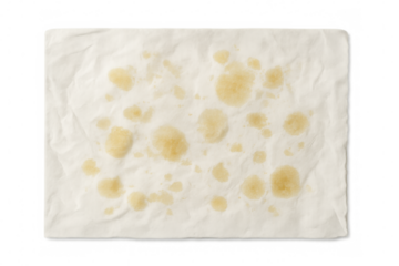Greasy, crumpled white paper napkin revealing dirty stain, symbolizing cleaning challenge against messy surface backdrop