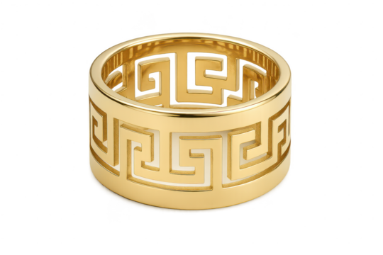 Stylish gold band ring with classic Greek key design, isolated on transparent background