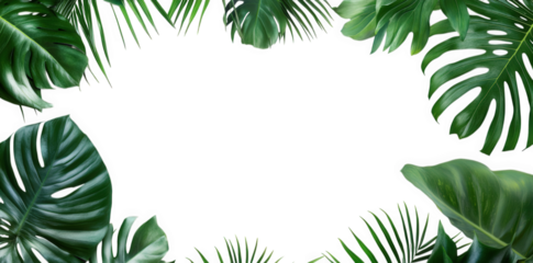 collection of lush green monstera leaves arranged around a blank white space. creating a natural frame it is ideal for use in design projects. invitations. or social media posts that aim to evoke a fr