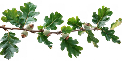 Green oak leaf with acorns isolated on white background, full depth of field