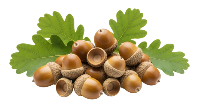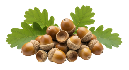 Collection of colourful autumn leaves and acorns isolated on a transparent background. Oak Leaf