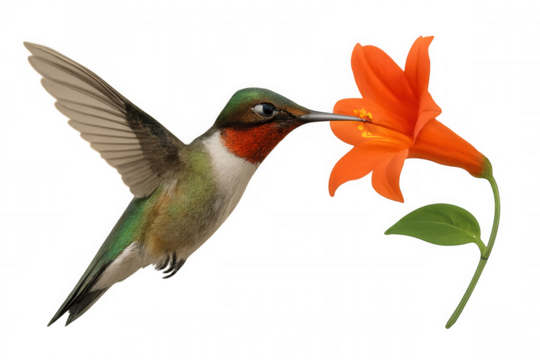 Hummingbird with ruby throat hovering, feeding nectar from an orange trumpet flower with transparent background