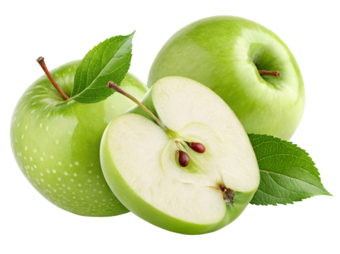 Fresh green apples and half apple isolated PNG with Transparent Background