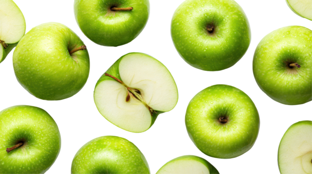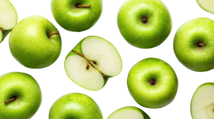 Green apples sliced and whole with leaf fruit slices isolated on a transparent background