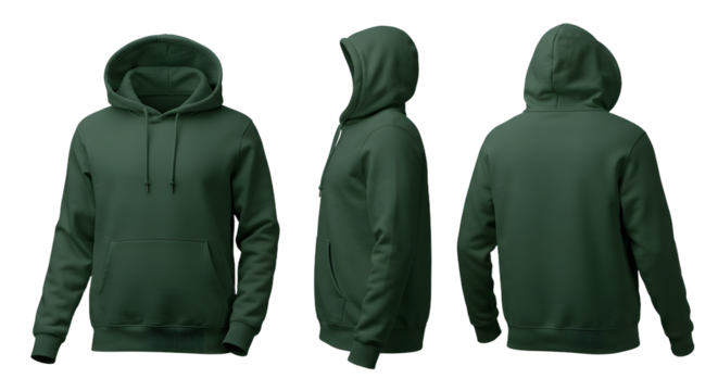 Green hoodie displayed from multiple angles, showcasing design details and fabric texture, suitable for casual wear