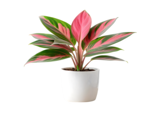 Aglaonema pink aurora plant in white pot isolated on transparent background