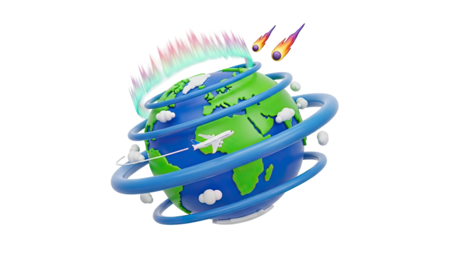 Stylized Earth with Airplane, Meteoroids, and Aurora