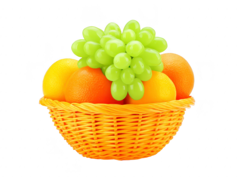 Vibrant basket filled with assorted fruits, including oranges and lemons, topped with cluster of green balloons resembling grapes. This colorful arrangement adds cheerful touch to any setting