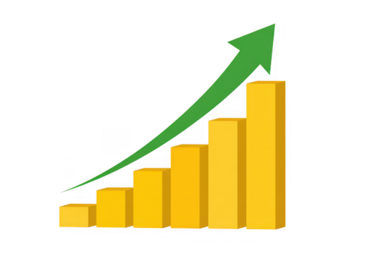 Colorful bar chart with upward trend arrow isolated on transparent background
