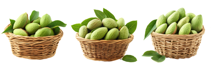 A set of fresh garden legumes, a collection of green edamame peas in woven baskets. Isolated on transparent Background