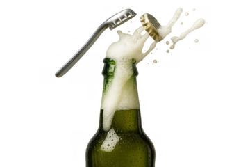 Green beer bottle being opened, cap flying off with foam and liquid splashing, transparent background, refreshment concept