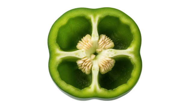 Green bell pepper half isolated PNG, cross section of fresh vegetable with seeds on transparent background, healthy eating ingredient