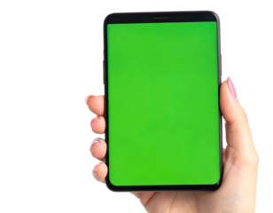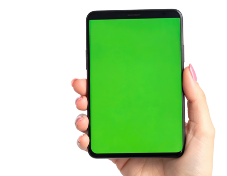 A close-up captures a hand delicately holding a smartphone with a vivid green screen