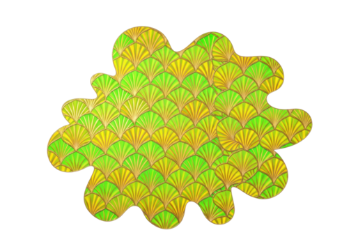 highly detailed abstract art deco scallop pattern with a vibrant lime green to yellow gradient and shimmering metallic gold lines, isolated on a transparent background, luxurious high-fashion