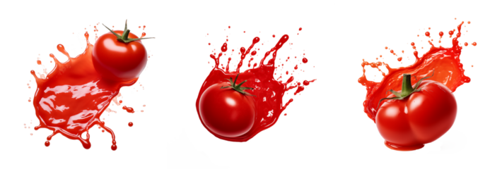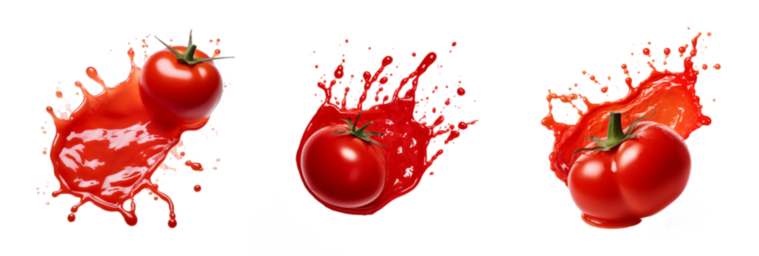 Set of ketchup explosion. Bright splashes of tomato ketchup, cut out - stock png.