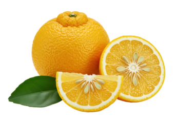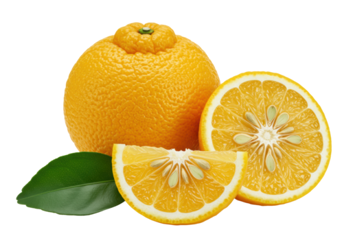 a hyper-detailed macro close-up of a whole and sliced vibrant orange-yellow yuzu fruit, showing glossy pulp, seeds, and a contrasting green leaf, isolated on a white studio background. concept for