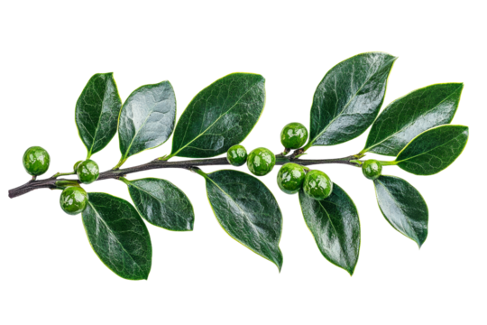 Glossy green leaves on brown branch on transparent background