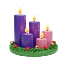 A colorful Christmas advent wreath with purple, pink, and green candles and ornaments.