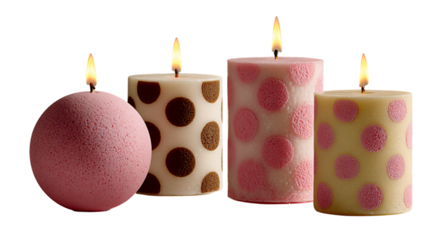 Five colorful pillar candles burning on white background isolated on a transparent background