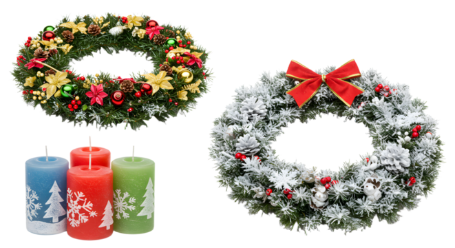 Three colorful pillar candles with yellow ribbon bows isolated on transparent background