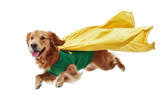 Golden retriever dressed as a superhero with a yellow cape and green outfit, mid-air, showcasing energy, playfulness, and fun.