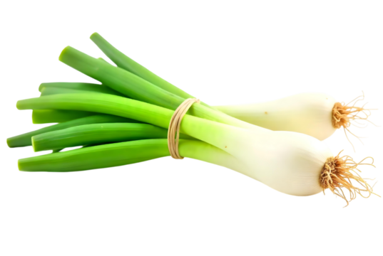 Fresh Green Onions Bunch with Roots Tied Together white backgr
