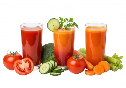 Fresh vegetable juices with ingredients isolated on a transparent background