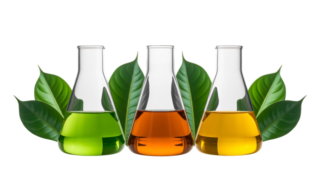Three chemical laboratory flasks containing distinct green orange and yellow liquid solutions and green leaves, isolated on transparent background