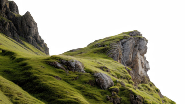 A rocky mountain with green grass isolated on transparent background