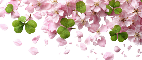Pink blossoms and green clover leaves isolated on transparent background