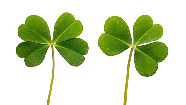 Green clovers with four leaves and three leaves are visible in a group with one standing up tall plain white background and png