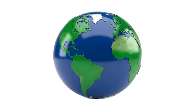 Illustration of a colorful 3d earth globe with blue oceans and green continents isolated on transparent background on transparent background