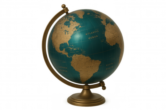 Classic Blue and Green Earth Globe on Stand, isolated on a transparent background.