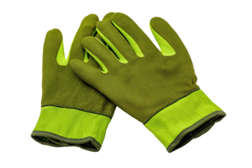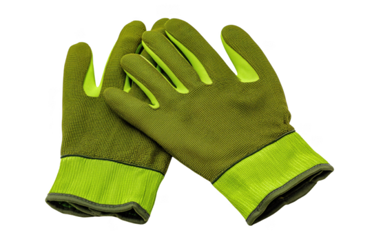 Pair of green and yellow work gloves with textured fabric isolated on a transparent background image