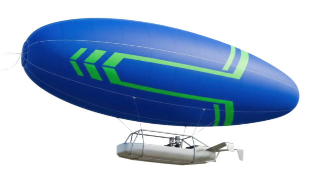 Isolated blue airship blimp with green design, aerial transportation, sky vehicle, dirigible