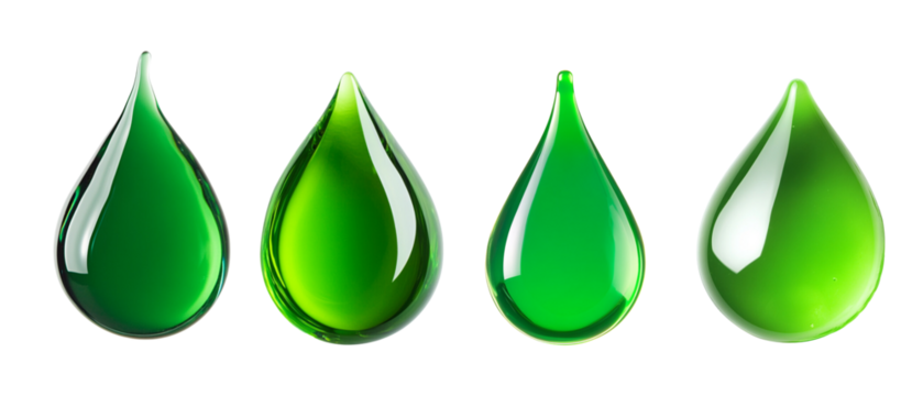 Set of four glossy green drops of liquid isolated on a white background, representing nature, freshness, and vitality.