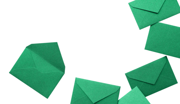 Green envelope for letters and invitations, design for stationery use on a transparent background, cut out