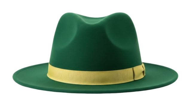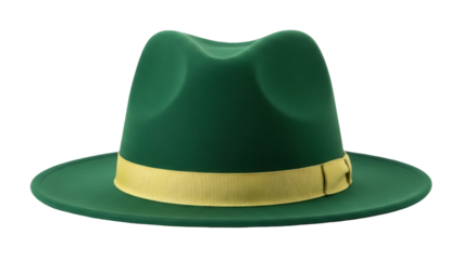 Bright green fedora hat with silver band on transparent background