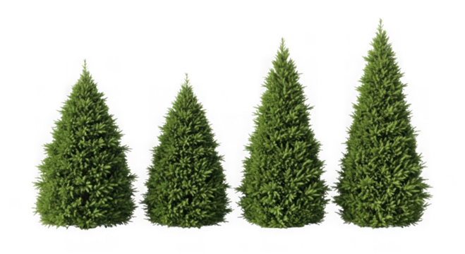 five photorealistic fir trees in a height gradient, showcasing dense green needles and brown bark texture, perfectly aligned against a transparent studio background. concept for commercial nature