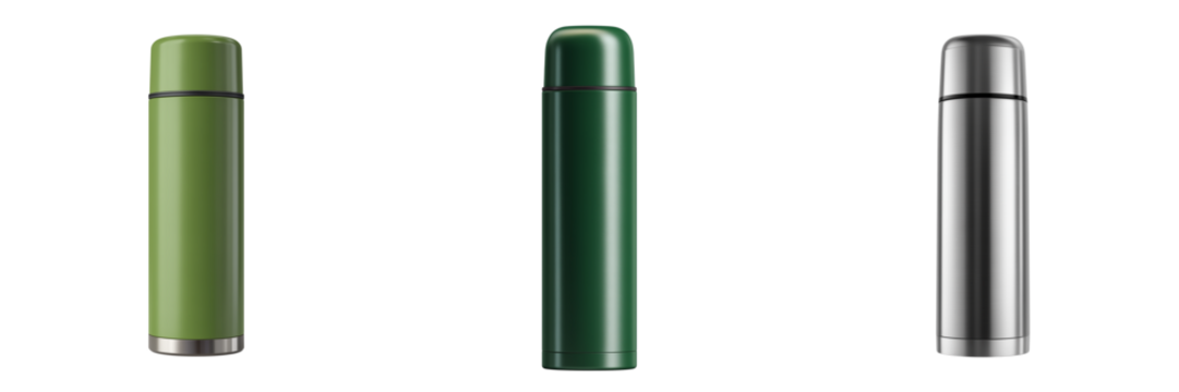 Three insulated vacuum flasks in green and silver colors isolated on a transparent background thermos
