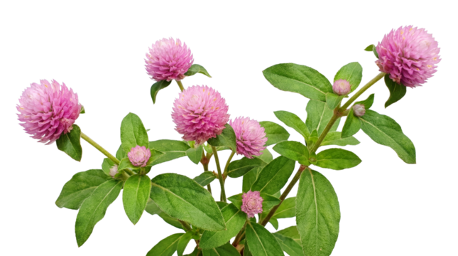 Bright pink globe amaranth flower cluster with vibrant green foliage on transparent background