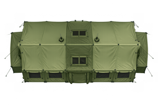 A green hiking backpack with multiple zippered compartments and mesh pockets isolated on a transparent background