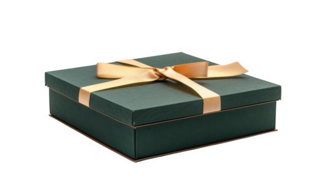 A beautifully wrapped gift box adorned with a delicate floral pattern and tied with a luxurious dark green ribbon and bow, isolated on a clean transparent background